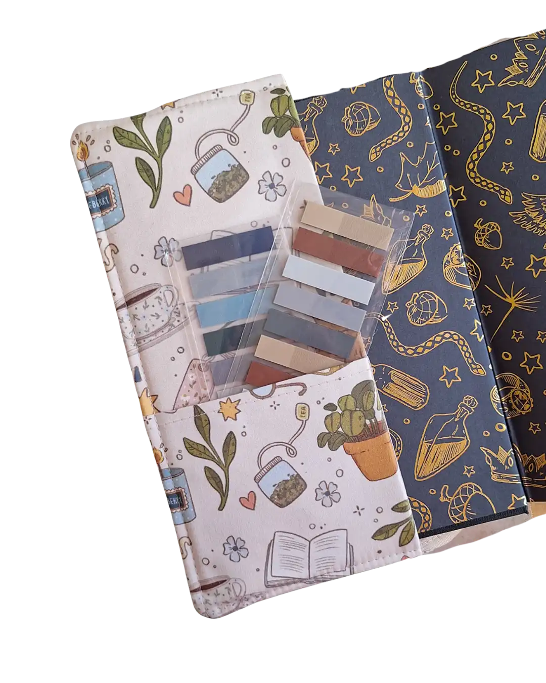 Su diseño con solapa ajustable permite adaptarse a distintos grosores de libro, manteniéndolo seguro sin importar si es una lectura ligera o una historia más extensa. Además, incluye una bolsa interna, perfecta para guardar separadores, post-its o incluso tu pluma favorita.